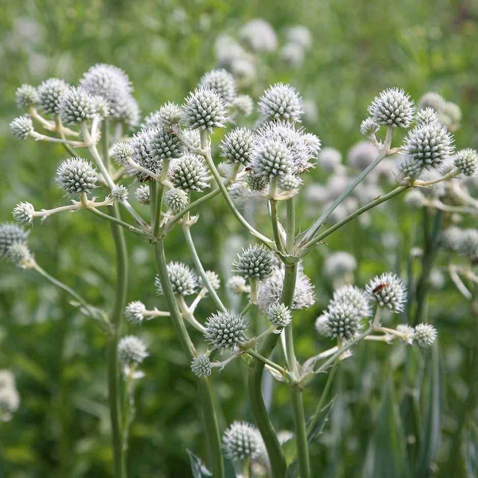 An evergreen eryngium, which forms a clump of bluish-green, strap-shaped leaves that have a serrated and spiny edge. In midsummer and autumn, upright, branching flowerspikes emerge bearing rounded or oval shaped flower clusters, which turn shades of greyish-blue, cream or green as they open. A variable plant, which originates from the Eastern States of the US, it is tolerant of poor soil and drought once established.