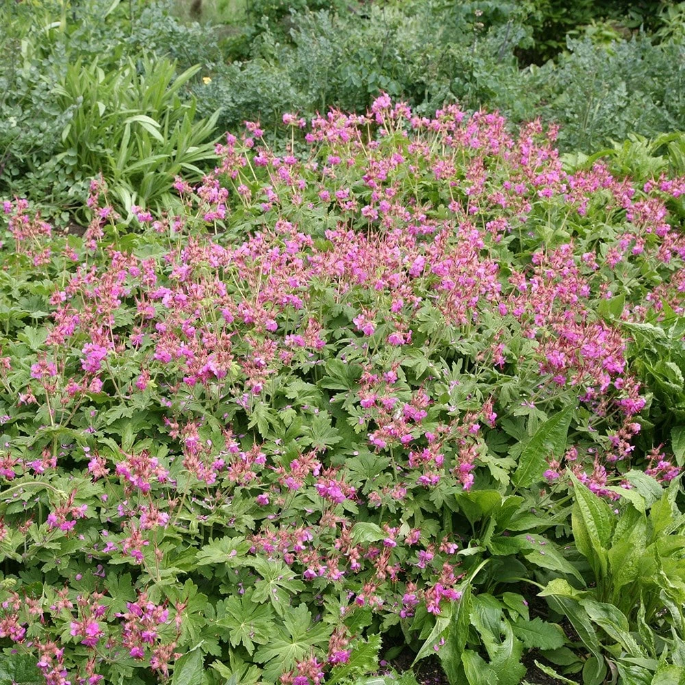 Clusters of small, saucer shaped, crimson-purple flowers are held on slender stems above strong aromatic, light green leaves from May to September. This is one of the most versatile and useful geraniums, as it will even thrive in dry shade. The deeply cut, semi-evergreen foliage also spreads quickly to form low hummocks that suppress weeds for most of the year. It looks lovely with strongly shaped perennials, such as bergenia, or polemonium, or planted en masse under trees, and is also valuable for hiding the foliage of spring bulbs as they die down. The leaves often turn red in autumn, too.