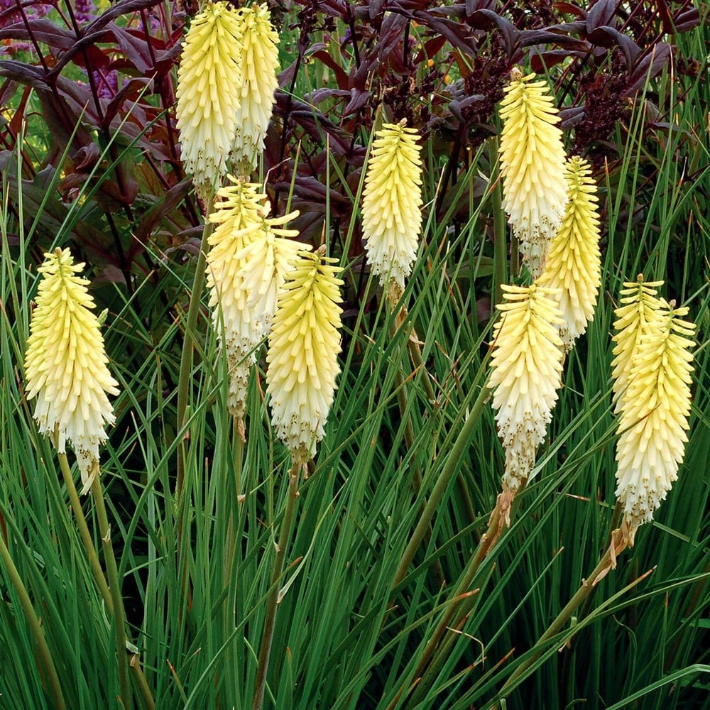 Initially deep orange red, the buds of this herbaceous perennial with linear, grass-like leaves, become paler before they open, while the flowers of ‘Pineapple Popsicle’ continue to fade to pale yellow as they mature. This creates a markedly two-tone effect on each flower spike in a plant that is suited to hot, dry summers once established. The neat foliage is an added bonus. Modest in height, this ‘Red Hot Poker’ will make a good potted subject on a south-facing terrace. Seen here flowering with Agastache โSummer Loveโ.