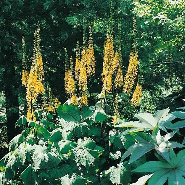 Slender spikes of brilliant yellow flowers on dramatic black stems zoom above large, handsome, boldly toothed leaves in July and August. This towering deciduous perennial makes a striking specimen plant for a moist, sunny border or bog garden. Or try it beside water, and make sure it has protection from the strong, midday sun.