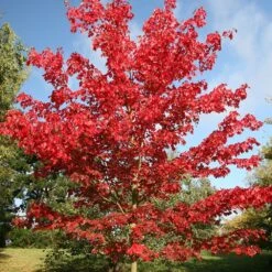 A gorgeous tree, with large, star-like, shiny, bright green leaves which turn brilliant purple, then shades of orange and yellow in the autumn. It has a rounded, heavy crown, and although it is not particularly fast-growing, it is not suitable for a small garden, as it is long-lived and will eventually grow to 25 metres. In Britain, it flowers intermittently and inconspicuously in spring, but it is for the foliage that this tree is prized. Grow it either as a specimen tree in grass, or as the centrepiece to a glade. Trees grown in a rich, damp soil in full sun will colour the best.
