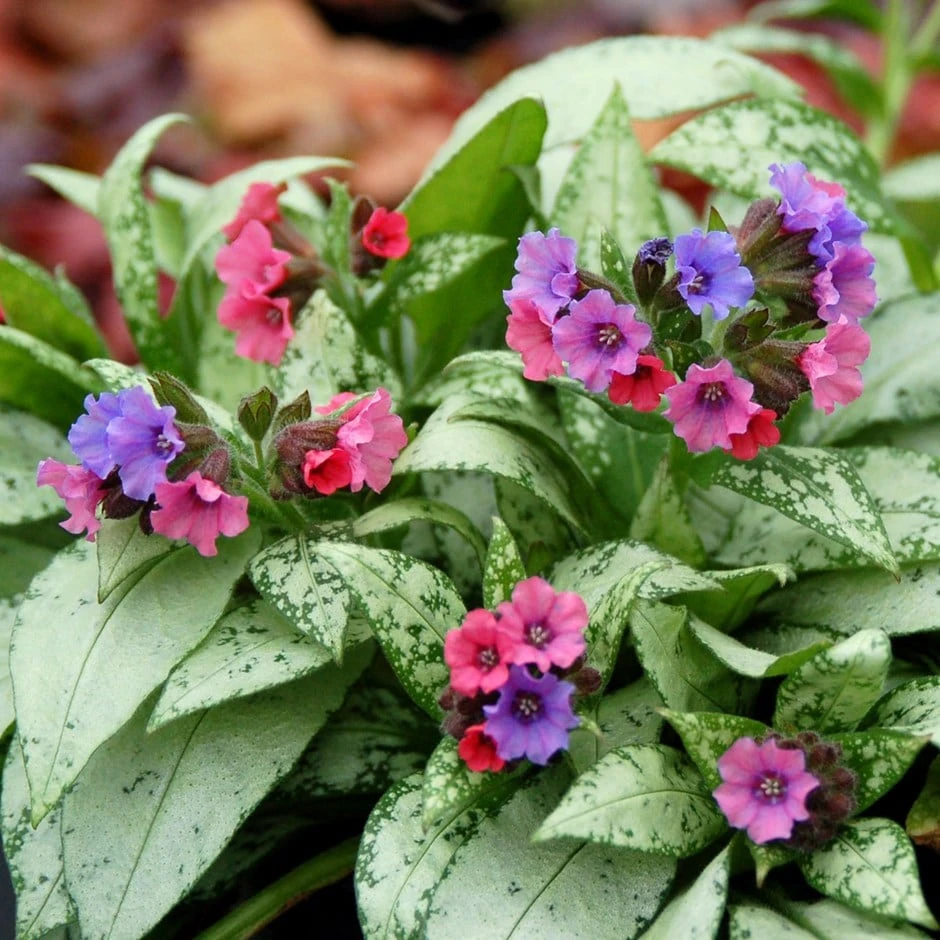 This attractive, early-flowering perennial will help liven up the woodland floor in spring. It forms a good-sized clump of slender, pointed leaves, which are generously daubed in silver. The flaring bell-shaped flowers form in clusters, and are held above the foliage on upright stems, opening pink, but turning blue as they age. This, coupled with the silvery foliage, which may be retained during milder winters and shows some resistance to powdery mildew, creates a very colourful effect.